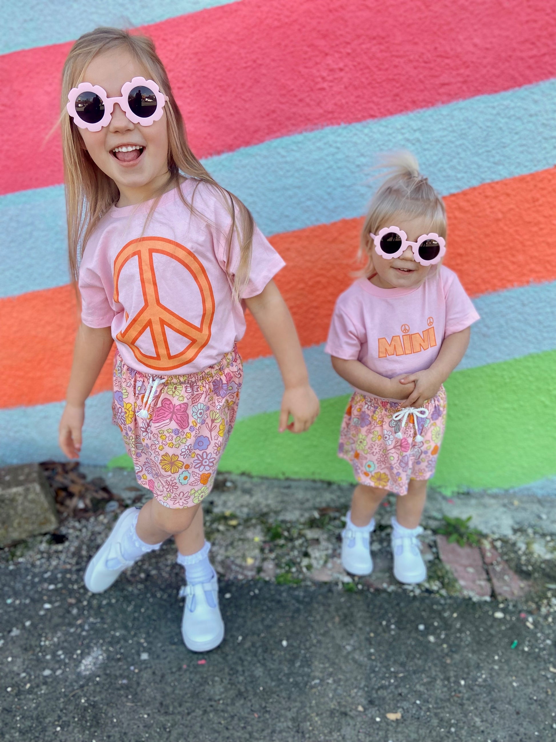 We love the big orange peace sign on this pink tee. It's totally cool and sure to be an instant hit! Be sure to check out the mom and other matching toddler tee too!!