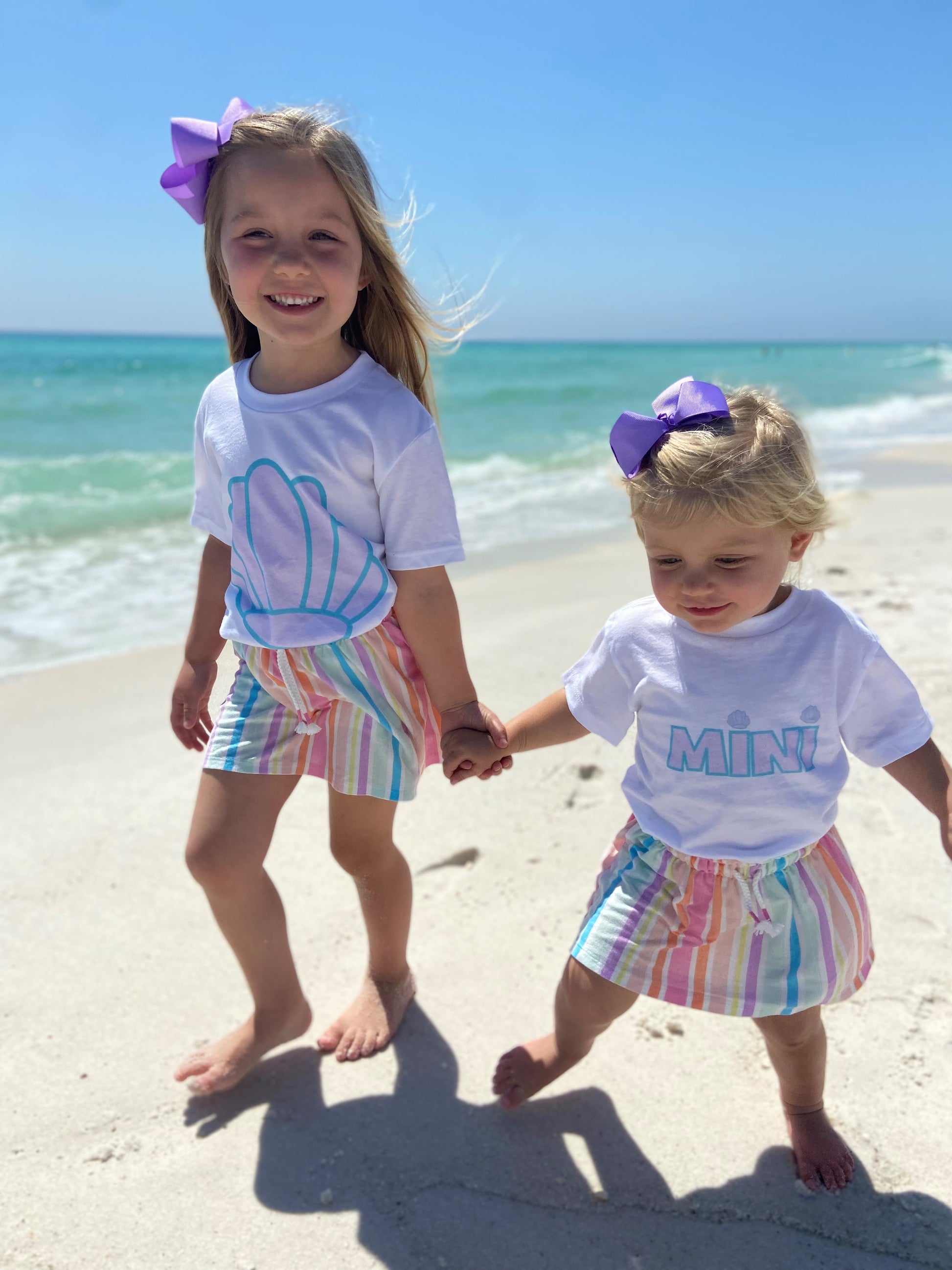 Calling all beach lovers!! This tee is perfect for matching travel days, using as a cover up or putting on after a long day out in the sun. It's even perfect for mermaid loving girls who are digging in the sandbox in the back yard! The turquoise and lavender color combo definitely give us mermaid princess vibes! Don't forget to check out the matching mom tee and older sibling one too!